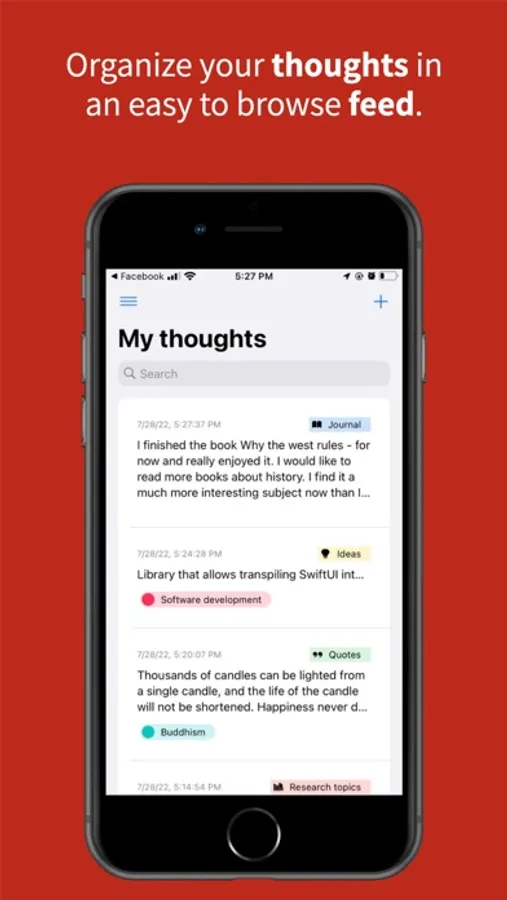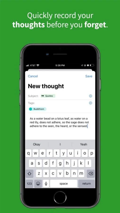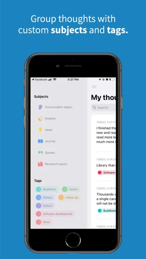 Quickly organize your thoughts into an easy to navigate database. Sort thoughts into subjects and tags to group your ideas together.