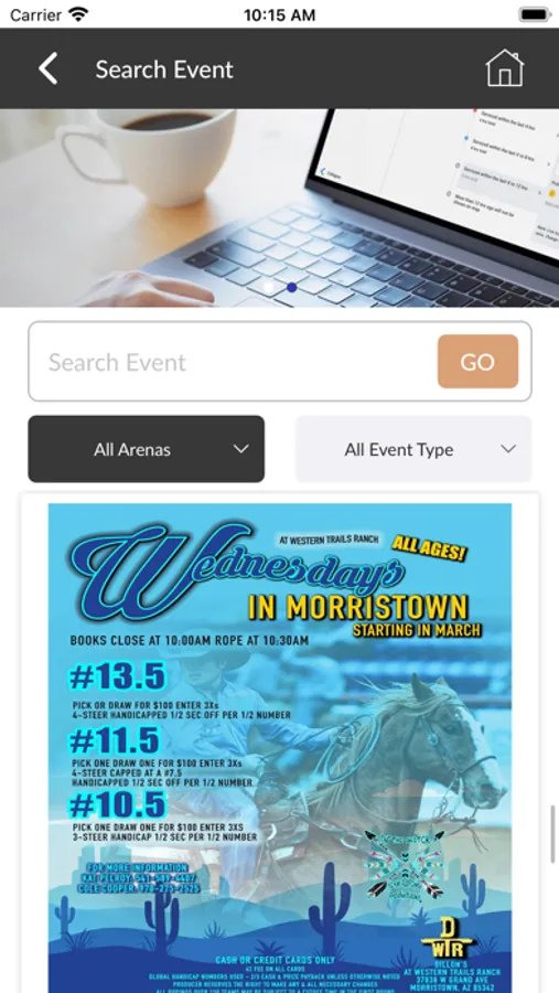 Roping Calendar promotes daily equine event information within the state of Arizona and surrounding regions. Categorical data entry of event flyers ensures accurate and time-sensitive information is accessible to participants. Events are made searchable by Arena, Event Type, and Roping Number.