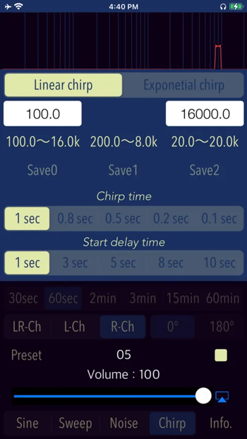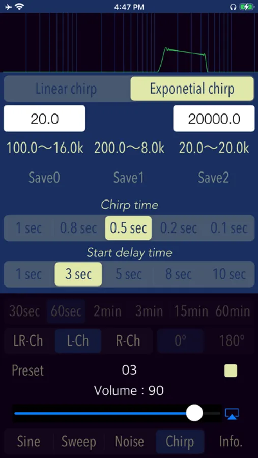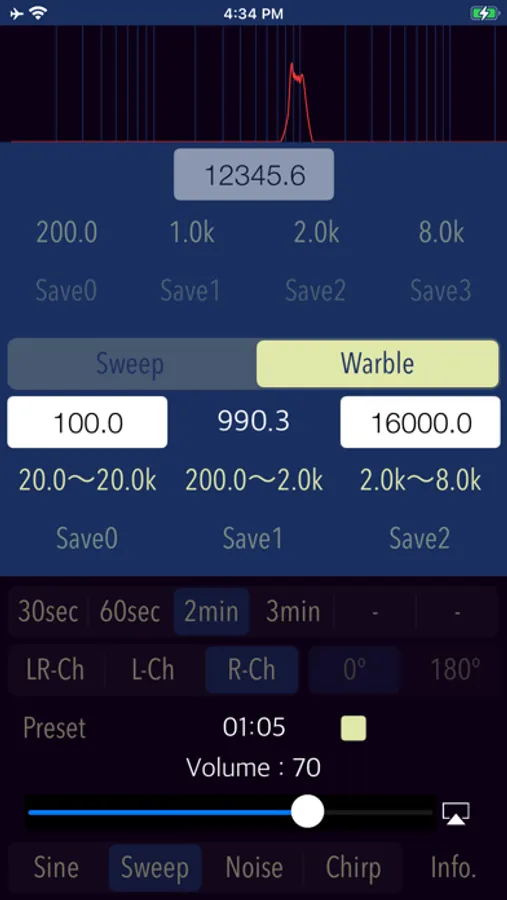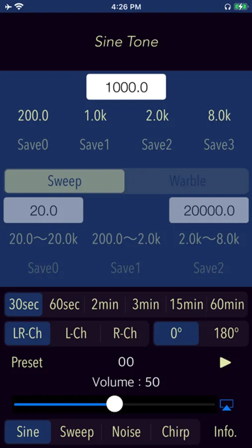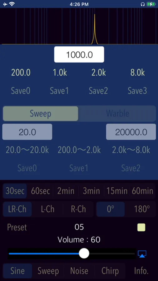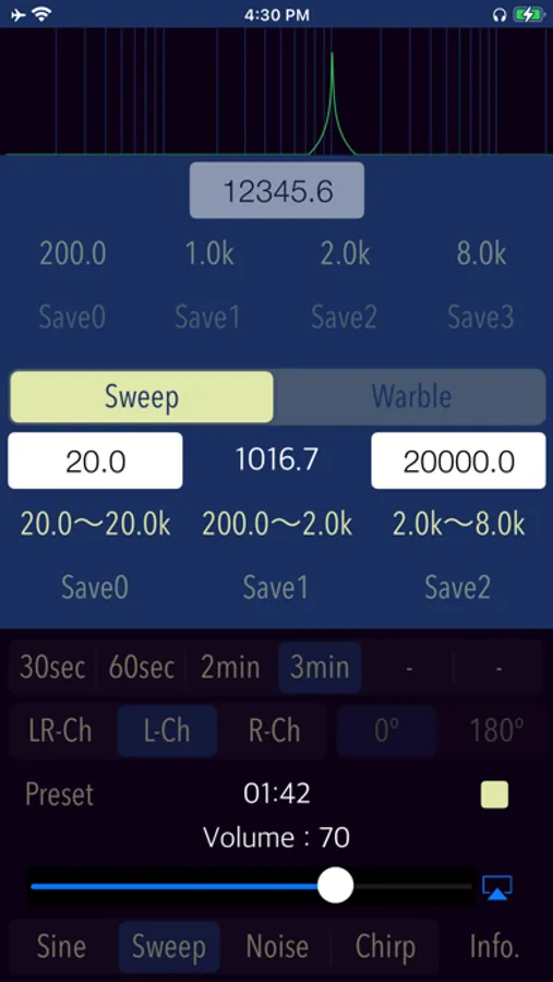 - Frequency Sweep generator (Sweep): Sine wave frequency sweep/warble signal (Preset frequencies: 20Hz - 20kHz, 200Hz - 2kHz, 2kHz - 8kHz, transition time: 30, 60, 120, 180sec), up-sweep/down-sweep playback