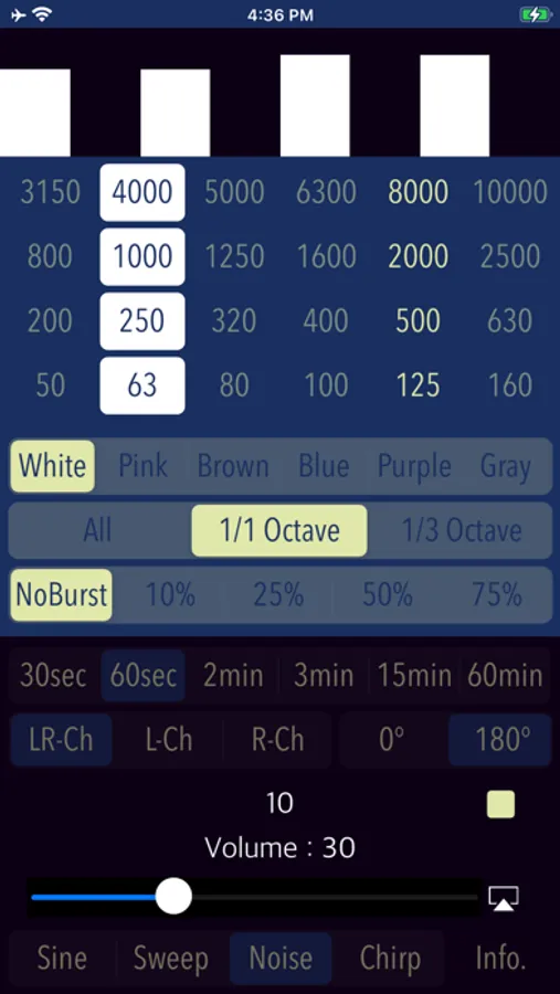 - Colored Noise generator with Octave-band Noise (Noise): White noise, Pink noise, Brown noise, Blue noise, Purple noise and Gray noise. Octave band noise generation by 1/1 or 1/3 octave-band filer (center frequency: 63Hz - 8kHz / 50Hz - 10kHz), burst playback with duty ratio of 10/25/50/75%.