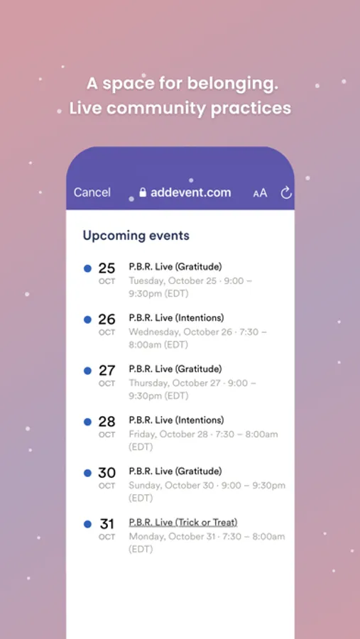 Join us for our 5X/week Live P.B.R. Meditations and practice with a community of like-hearted people.