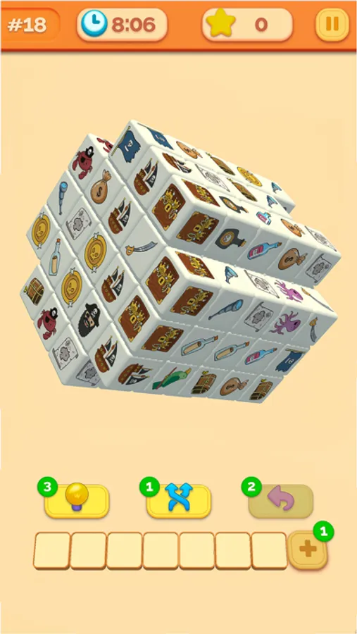 Your task is to rotate the 3D cube, find & match three identical tiles and clear the field!