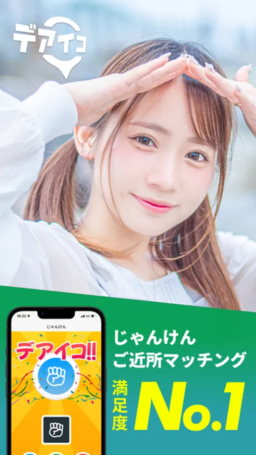 「デアイコ」はちょっとした空き時間で普段の生活では出会えない友達とじゃんけんゲームで簡単にマッチングできるご近所出会い系SNSです。
