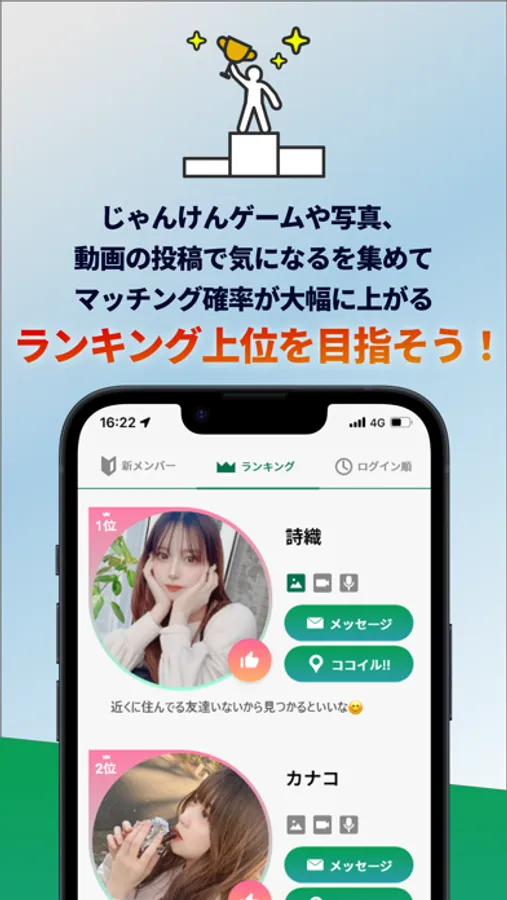 じゃんけんゲーム以外にも真面目な恋愛・恋人探し・出会い探しにも役立つ豊富な地図を利用した機能や好きな写真や動画を投稿して様々な人から『気になる』をもらってランキング入りも狙えちゃう!