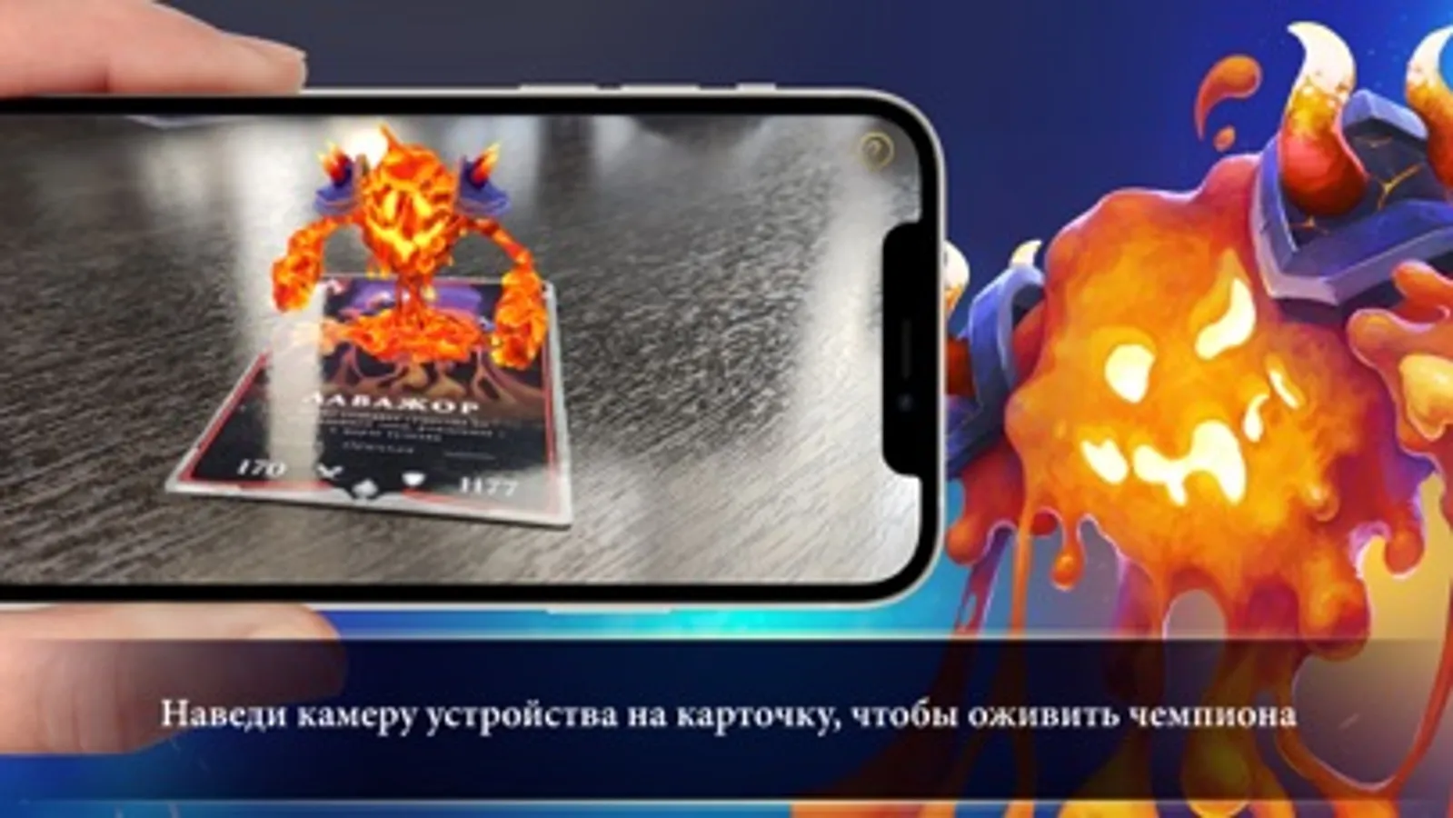 3) После того, как включится камера, наведи телефон или планшет на карточку с изображением чемпиона, артефакта и камня силы. Убедись что в комнате достаточно светло, а карточка лежит ровно.