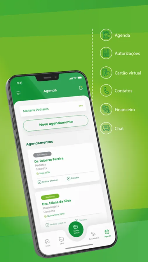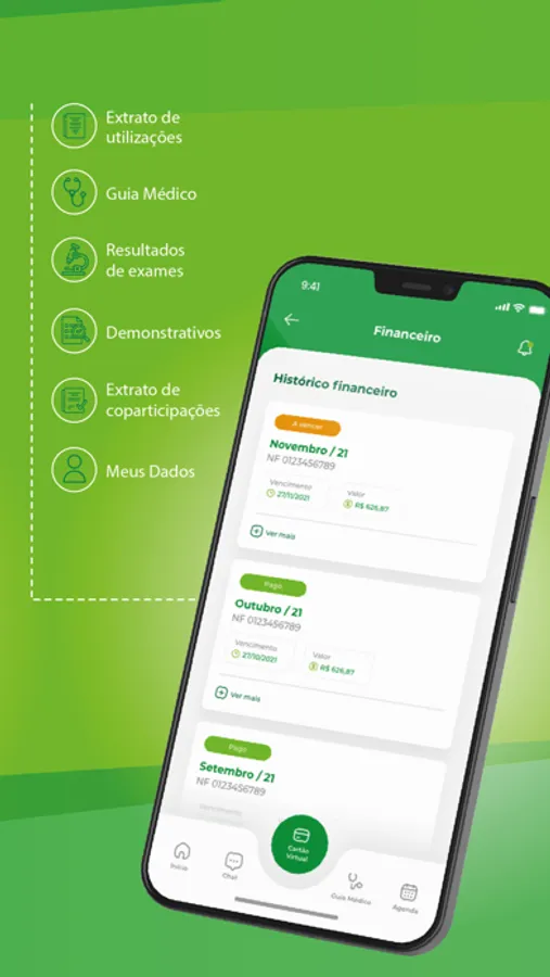 - Cartão virtual: Use o Cartão Virtual e não se preocupe mais em carregar sua carteira física do plano. Confira suas carências cumpridas e quais ainda faltam cumprir.