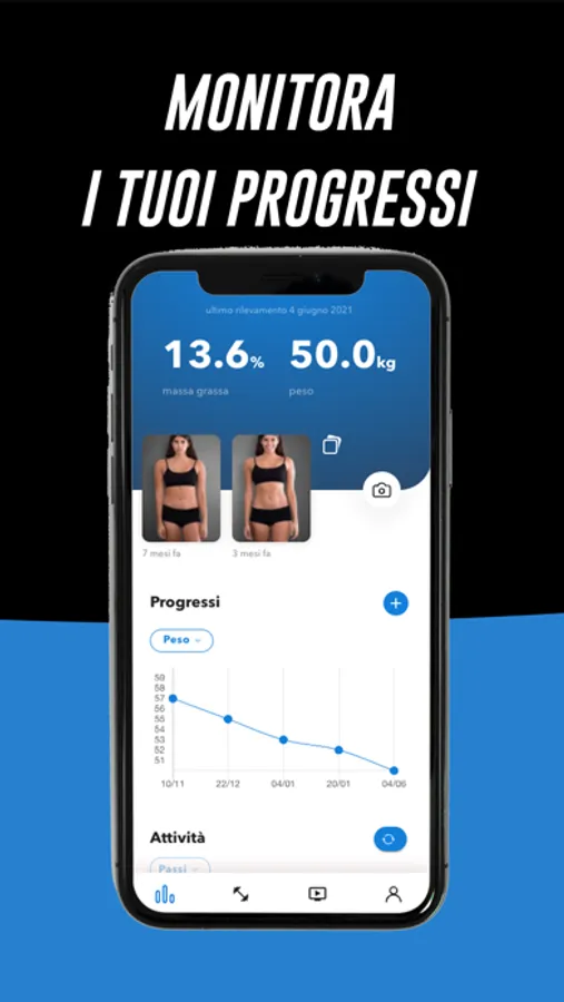 Avrai sempre sotto controllo la tua attività fisica: potrai visualizzare quali esercizi sono previsti nel tuo piano di allenamento, i tuoi progressi e come cambia il tuo fisico nel corso del tempo.