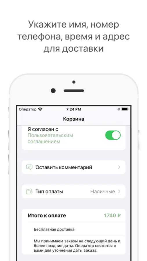 Укажите время и адрес для доставки.