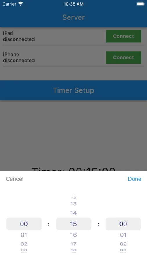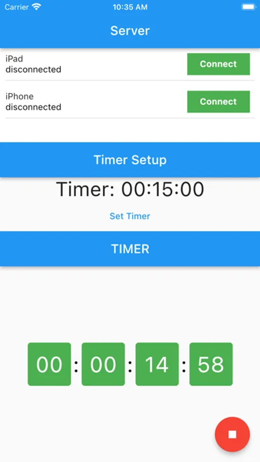 The app can be used to remote control a countdown timer on one or multiple devices. By selecting one server and multiple clients, you can set the timer limit, and start and stop the timer on all devices after connecting to them initially.
