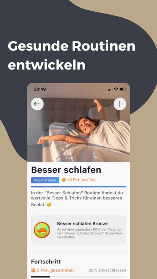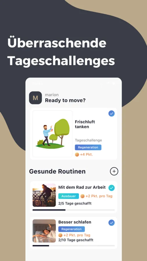 • Schritte sammeln: Sammle täglich Schritte, um auch die Ausdauerkomponente in deinen Alltag zu integrieren. Eine Integration der Schrittpunkte erfolgt derzeit je nach Gerätetyp über Apple Health oder Google Fit.