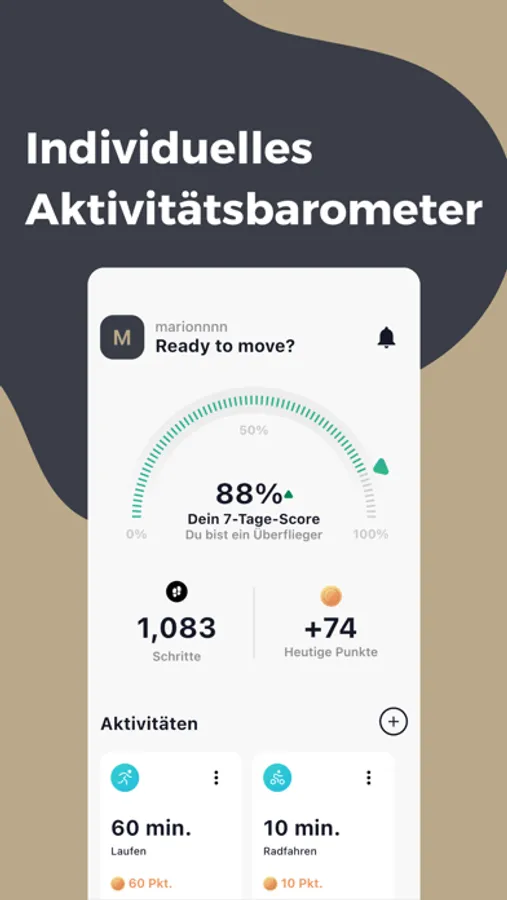 • Aktivitäten erfassen: Auch mit deinen sportlichen Aktivitäten sammelst du Punkte. Wähle aus einer Vielzahl von Sportarten und hole dir zusätzliche Punkte für deinen Score.