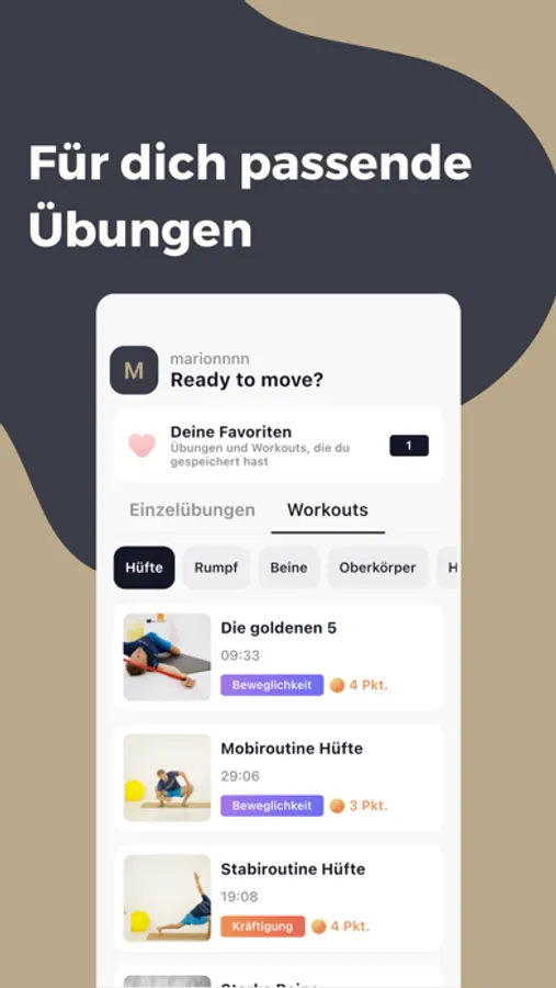 Darin findest du eine Übungssammlung mit den wichtigsten Übungen und Workouts, um beweglich und kräftig zu bleiben. Von Kopf bis Fuß ist für viele Probleme und Wehwehchen die richtige Übung dabei - Nackenverspannungen, Rückenschmerzen und Knieprobleme gehören damit der Vergangenheit an. Deine Lieblingsübungen kannst du auch als Favoriten abspeichern.