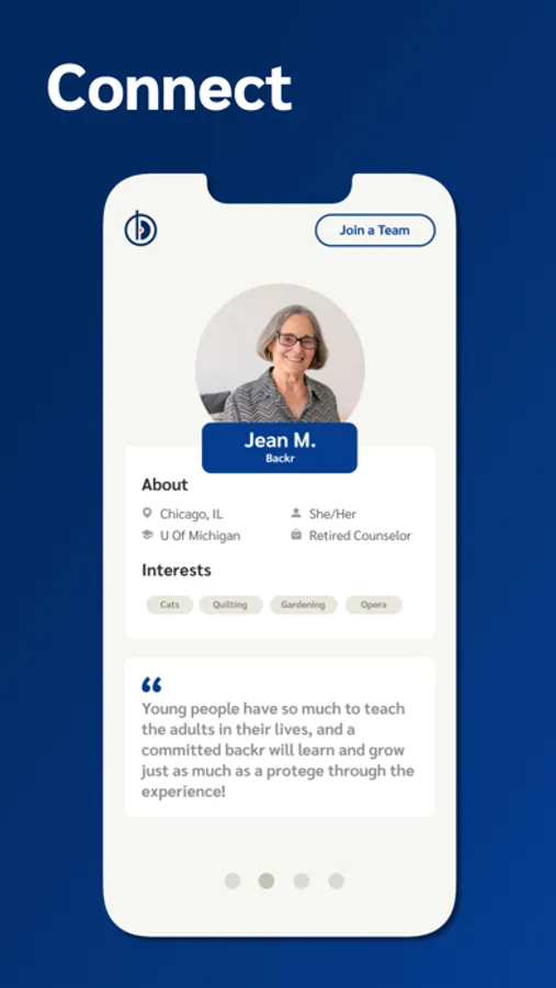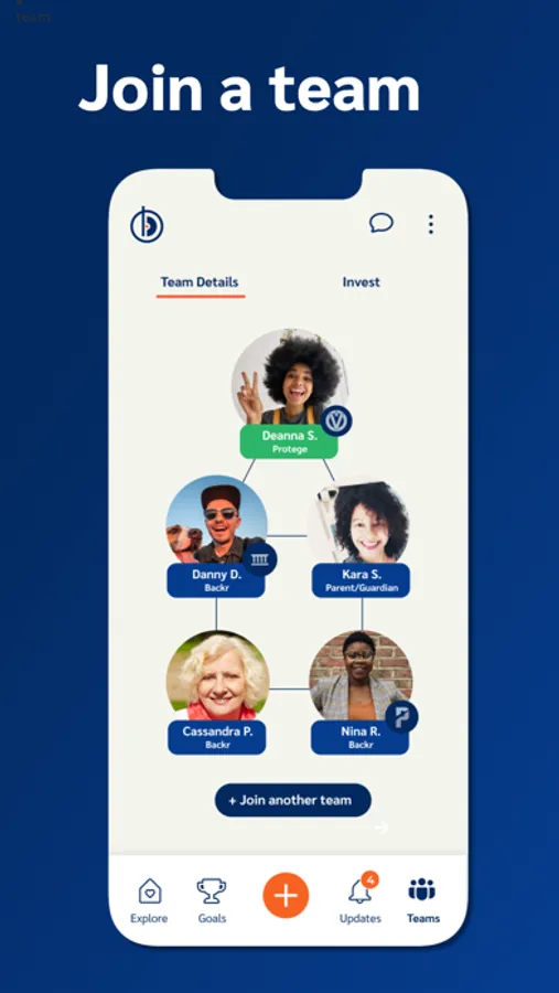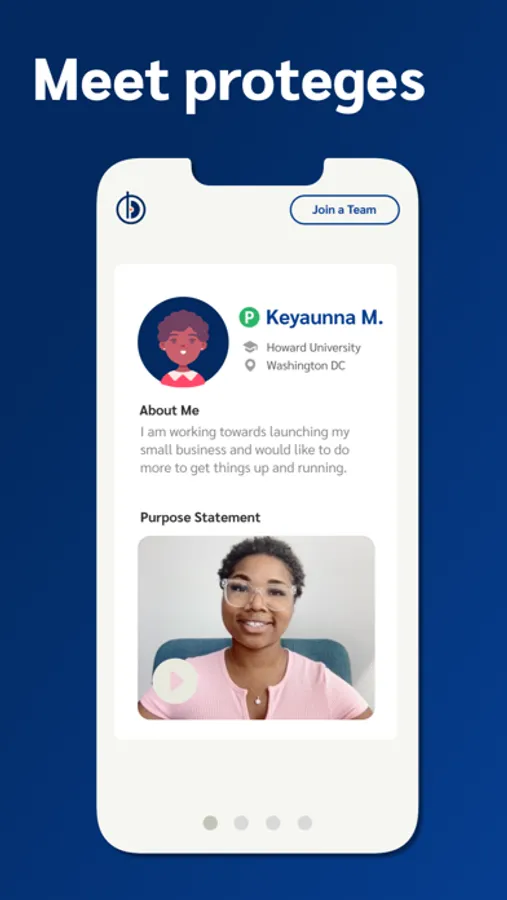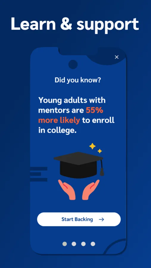 Young people who join Backrs become proteges who receive a variety of resources from their personalized team of Backrs: money, knowledge, engagement, and connections. Young people also chronicle their journey and share updates with their team.