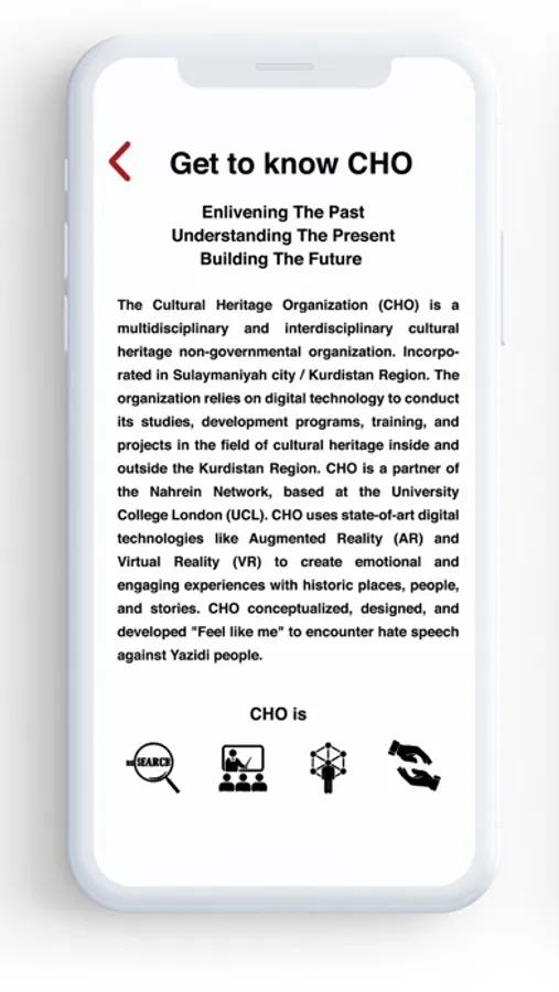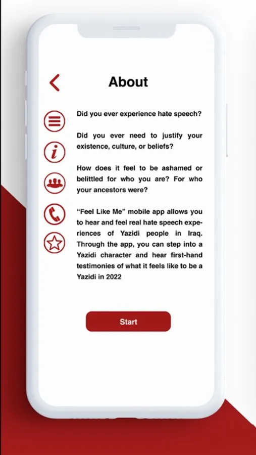 "Feel Like Me" mobile app allows you to hear and feel real hate speech experiences of Yazidi people in Iraq. Through the app, you can step into a Yazidi character and hear first-hand testimonies of what it feels like to be a Yazidi in 2022