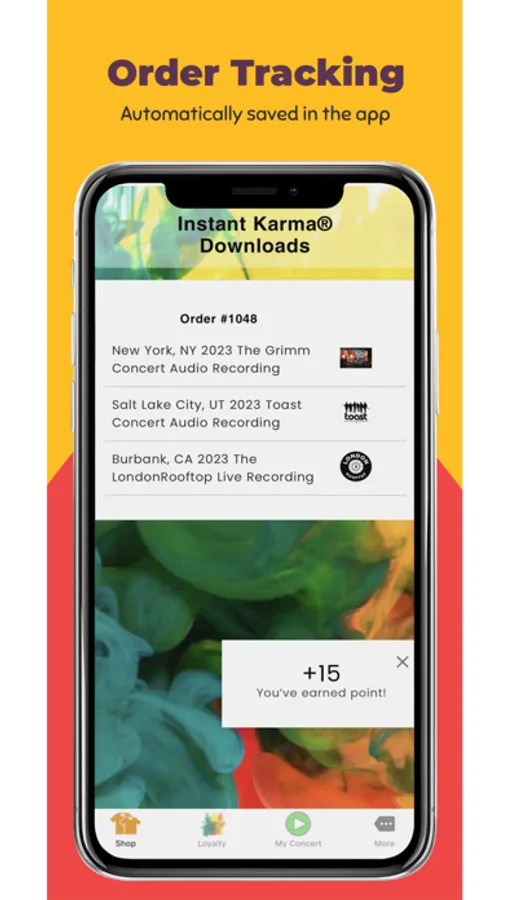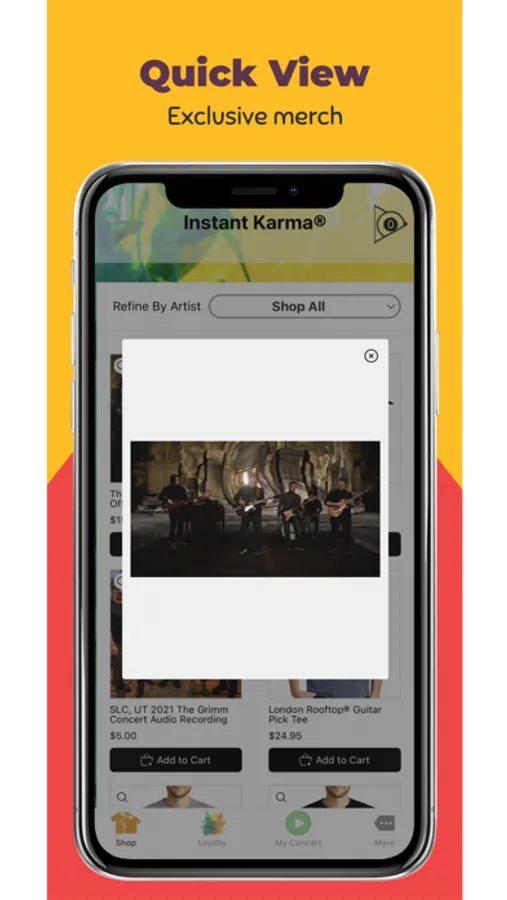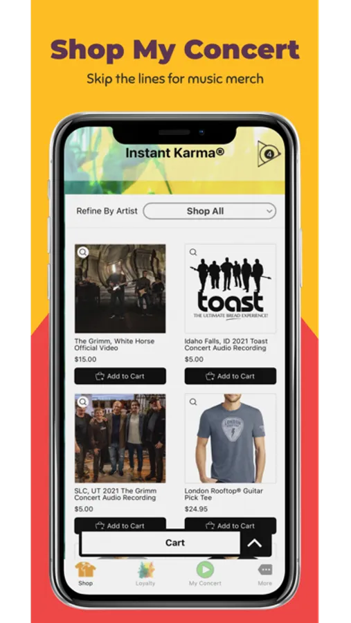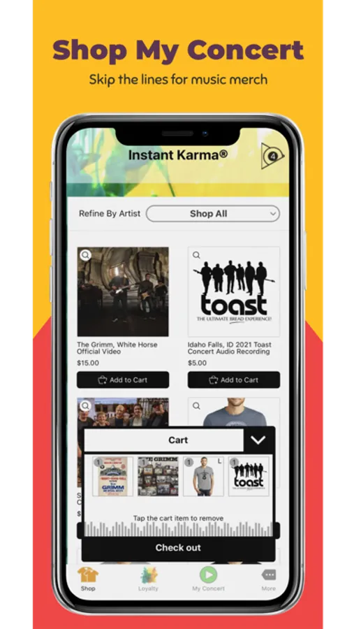 The Instant Karma® app gives you access to purchase live music, exclusive merchandise, and memorabilia from your favorite artists. Skip the lines – get stuff and let the good times roll.