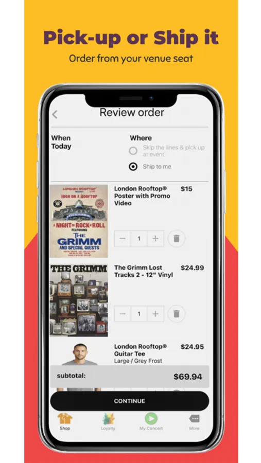 -Don’t wait in line to get your “last choice shirt in the wrong size.” Order with the Instant Karma® app and get your items shipped or select “pick-up at venue” for a hassle-free experience.