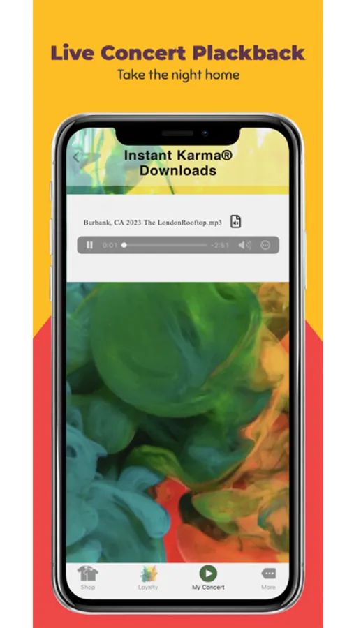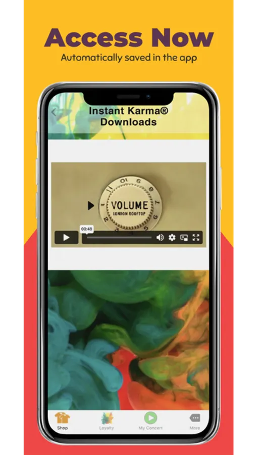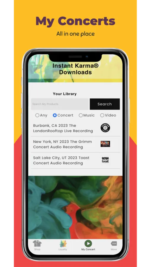 ConcertDirect® audio and video files are delivered by the Instant Karma® app. Add in our partnerships with venues, artists, and a streaming television show, shopping with the Instant Karma® app gives you exclusive access to the most memorable events worldwide.