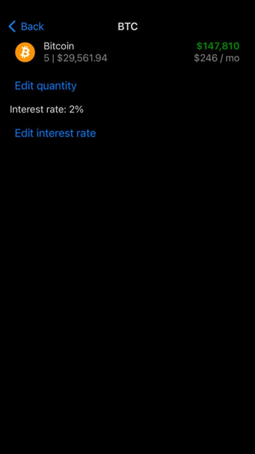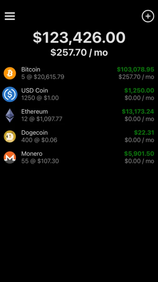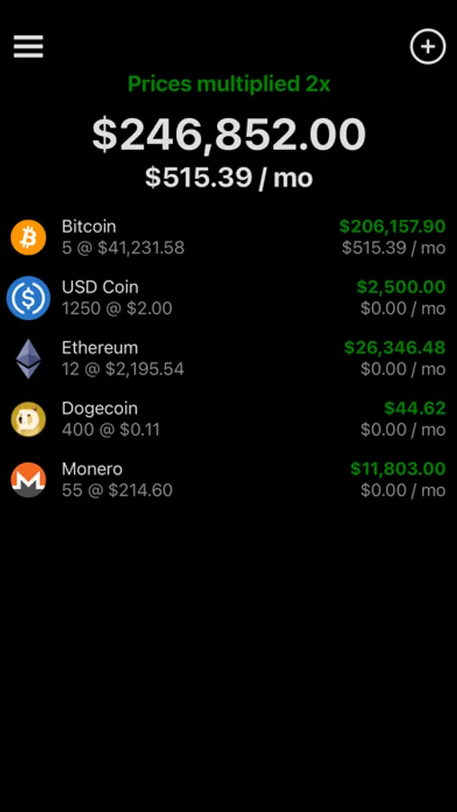 Quickly check the prices and total value of your cryptocurrency assets. Set a percentage they are earning in interest to quickly check your monthly income from cryptocurrency interest accounts. Use Dream mode in settings to apply a multiple to prices to see how your portfolio could grow or shrink.
