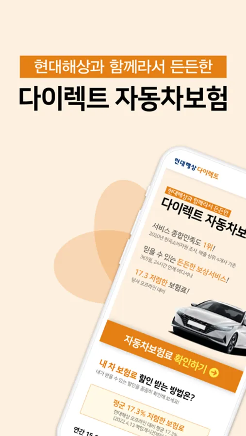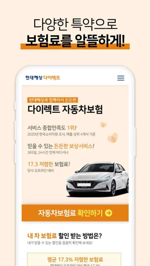 내 차보험료, 이제는 현대해상 다이렉트 자동차보험 계산 어플리케이션으로 저렴하게 이용하세요.