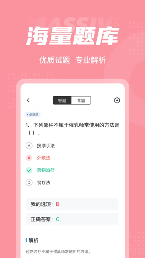 中医催乳师考试聚题库是一款针对中医催乳师考试的应用,主要功能特点包含: