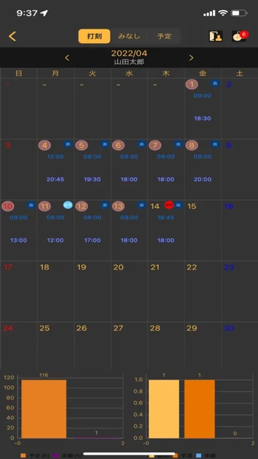 ・勤務時間や遅刻などを集計し、グラフで表示できます。