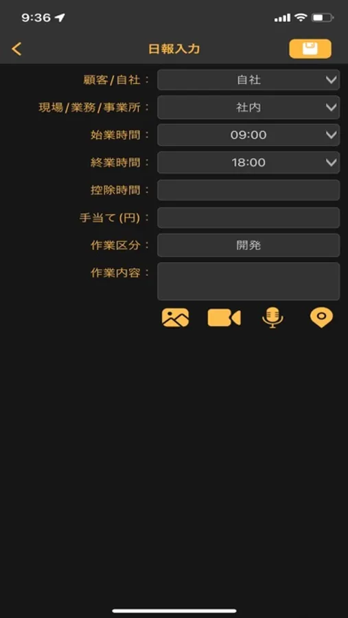 ・現場ごとに作業時間、内容、メディアファイルを入力できます。