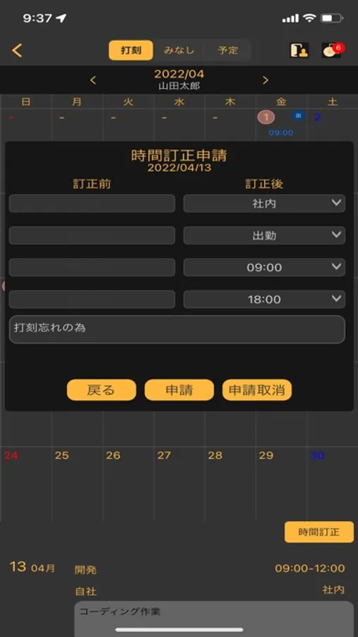 ・出退勤の打刻訂正や、勤務予定の申請ができます。