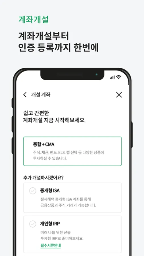 · 종합매매, 중개형 ISA, 개인형 IRP, 연금저축까지 원하는 계좌를 한번에 개설하여 인증서 발급까지