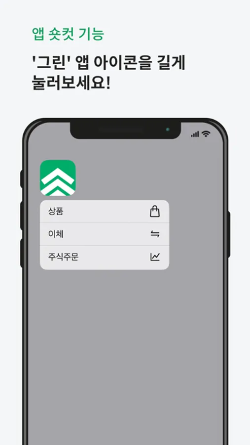 · ‘그린’ 아이콘을 길게 누르면 상품, 이체, 주식주문 화면으로 빠르게 이동