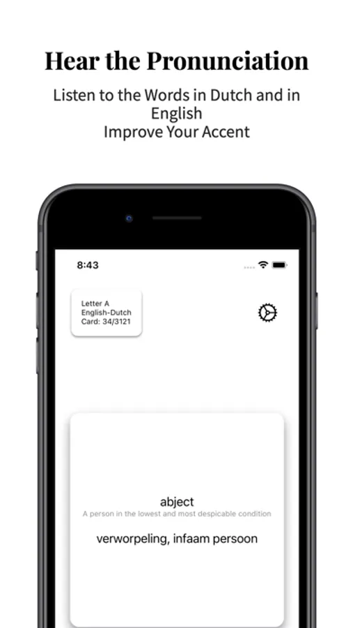 Words and their translation are pronounced in both languages (English and Dutch) so that you can hear the pronunciation and improve your Dutch accent.