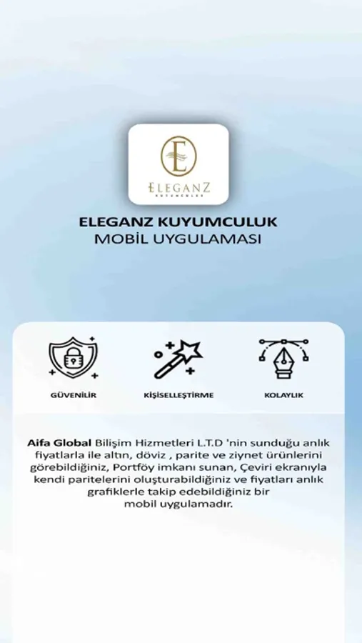 Aifa Global Bilişim Hizmetleri L.T.D 'nin sunduğu anlık fiyatlarla ile altın, döviz , parite ve ziynet ürünlerini görebildiğiniz , Portföy imkanı sunan, Çeviri ekranıyla kendi paritelerini oluşturabildiğiniz ve fiyatları anlık grafiklerle takip edebildiğiniz bir mobil uygulamadır.