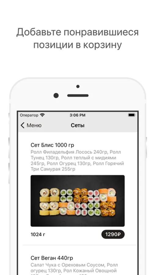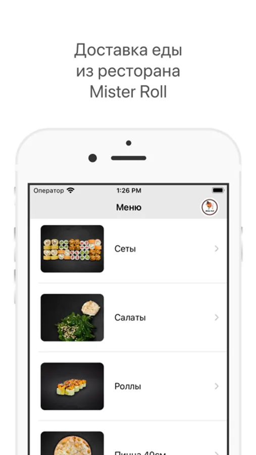 Как сделать заказ в приложении “Mister Roll”: выберите понравившиеся позиции из меню, добавьте их в корзину и перейдите на экран оформления заказа (по нажатию на иконку корзины).