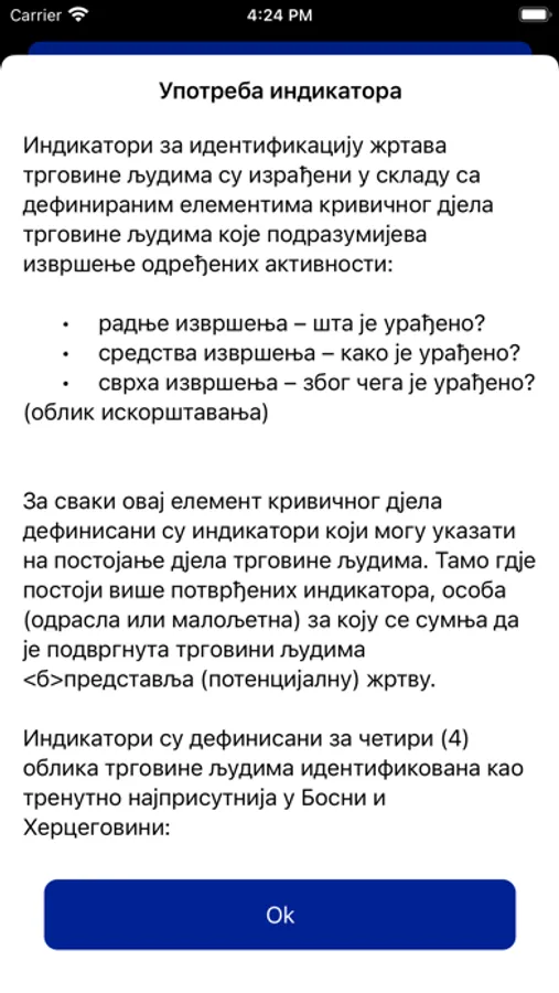 The tool for identification of potential victims enables the user of the application to identify a potential victim of human trafficking, by going through a set of indicators of exploitation developed in accordance with the defined elements of the crime of human trafficking.