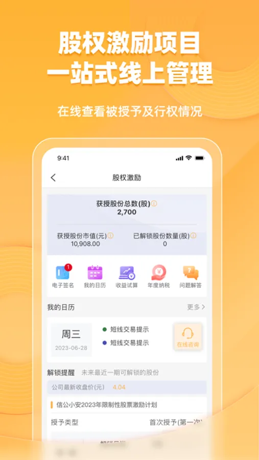 11.股权激励:股权激励项目一站式线上管理,被激励对象在线查看被授予及行权情况。