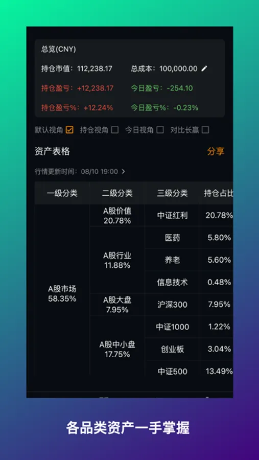 1. 资产配置看板工具:支持添加多类资产,提供每日实时数据监控。三种视角(持仓比例、持仓盈亏、今日盈亏)帮助你完成长期资产配置工作。