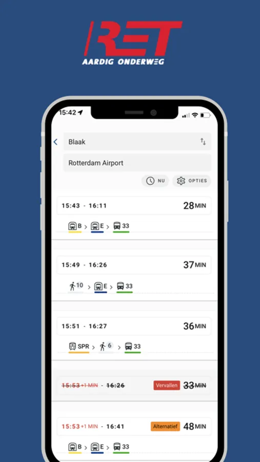 The RET app also shows the nearest stops with current departure times. Get a push notification when there is a disruption at one of your favorite lines or stops.