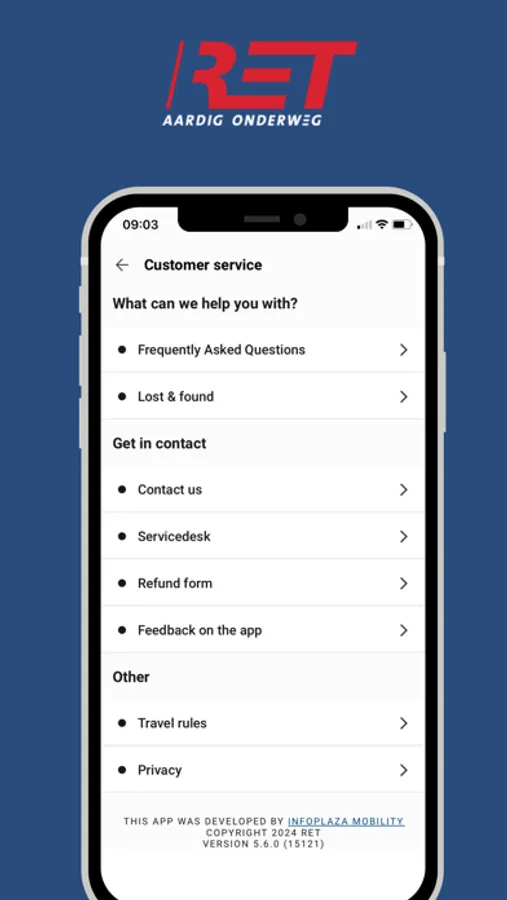 In the RET app you can find up to date information about public transport services in Rotterdam, see your travel history and buy barcode tickets to travel with the RET.