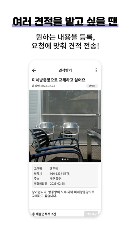 실시간 견적요청으로 동네 주변 여러 업체의 견적 및 상담을 편하게 받을 수 있습니다.