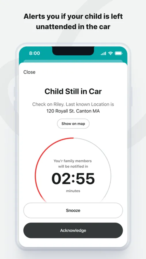 4. CHILD STILL IN CAR will alert the driver if a child has been left buckled inside a vehicle if the mobile phone has moved away from the clip. It will also alert family members with the location of the vehicle if the primary caregiver has not responded.