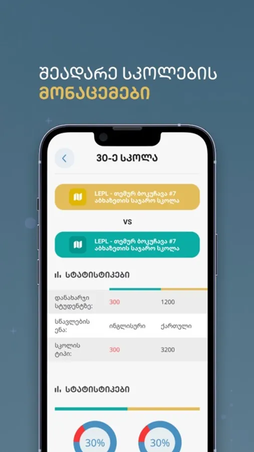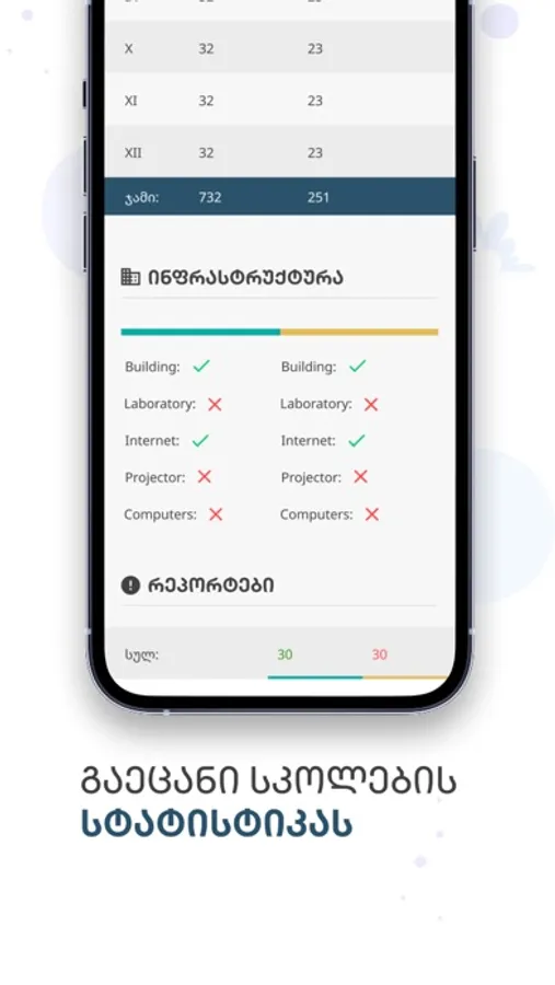 (A) Institutional Database: Quantitative information on each public school in Georgia. Incomplete list of data includes: (a) number of students and teachers, their characteristics; (B) the school budget; C) information about the school principal; D) student-teacher ratio; (E) costs per student; F) qualification and age of teachers; (G) School infrastructure and available resources; This section will enable citizens, schools, municipalities, local education resource centers, ministry agencies, to combine data and learn more about local contexts at the institutional, district, regional and central levels.