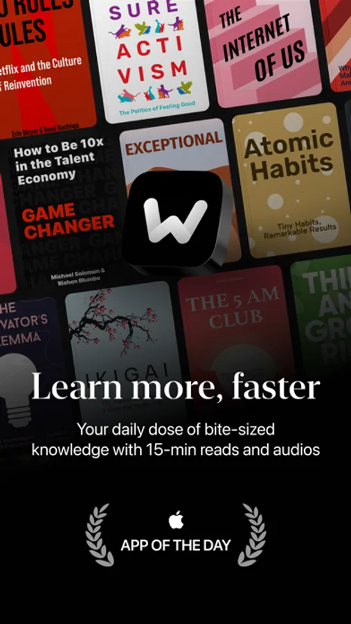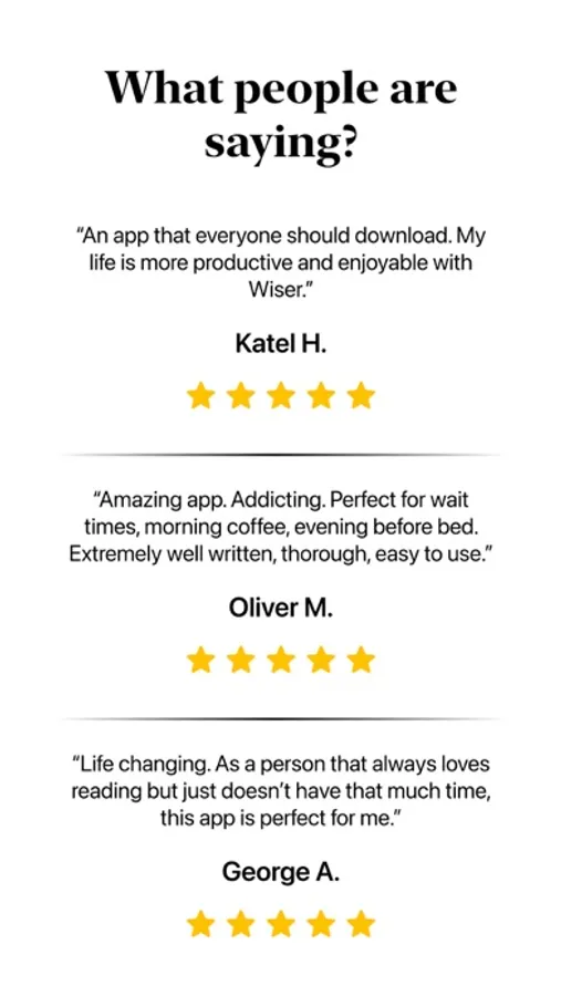 Wiser gives you access to the key insights from the world’s best books on Productivity, Business, Negotiation, Money, Investment, Health, Love, and more!
