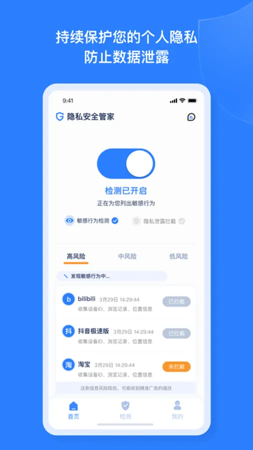隐私安全管家为国内关注隐私安全的先驱,通过DNS检测技术,可以帮您识别个人设备中对您隐私造成威胁的敏感行为和隐私泄露的风险