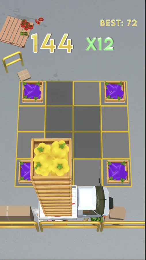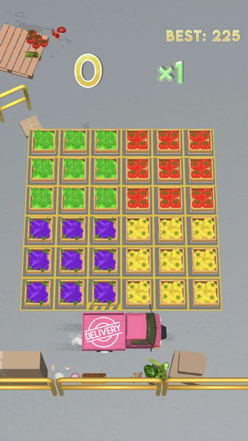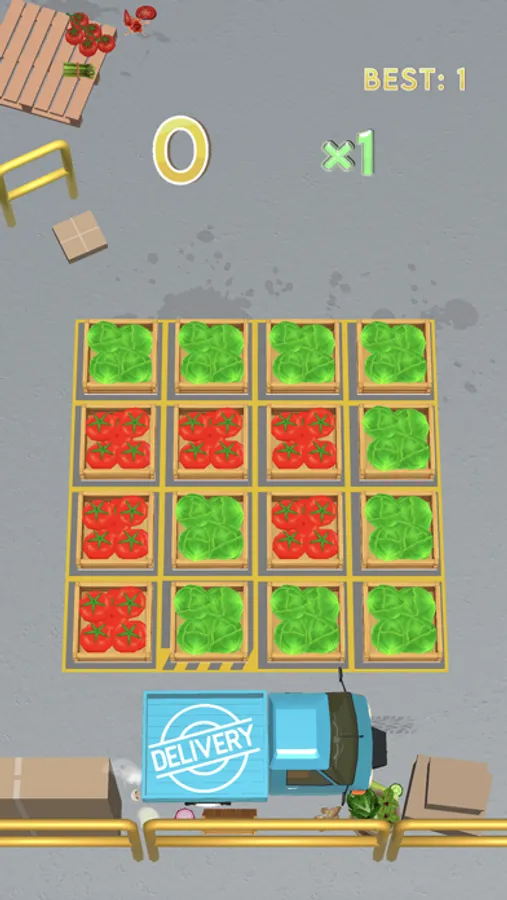 Stack the crates of the same color veggies to put them in the truck out for delivery! Will you be efficient?
