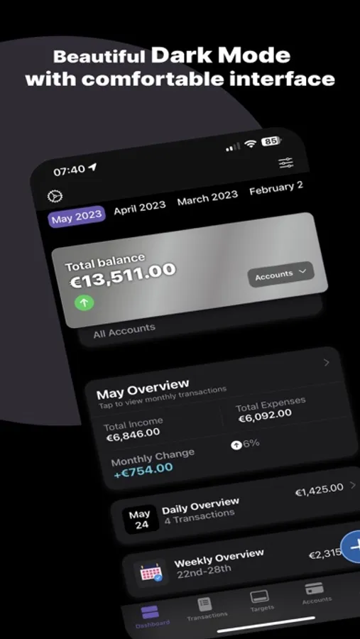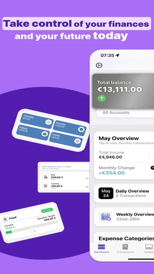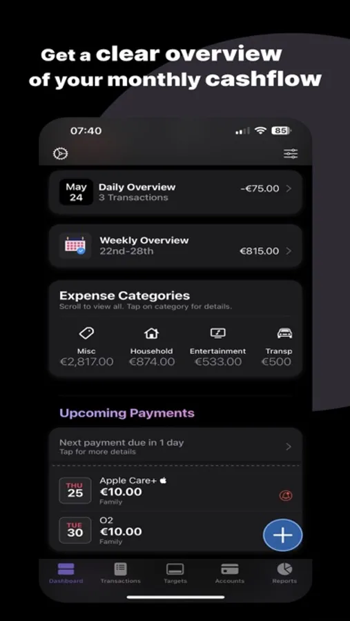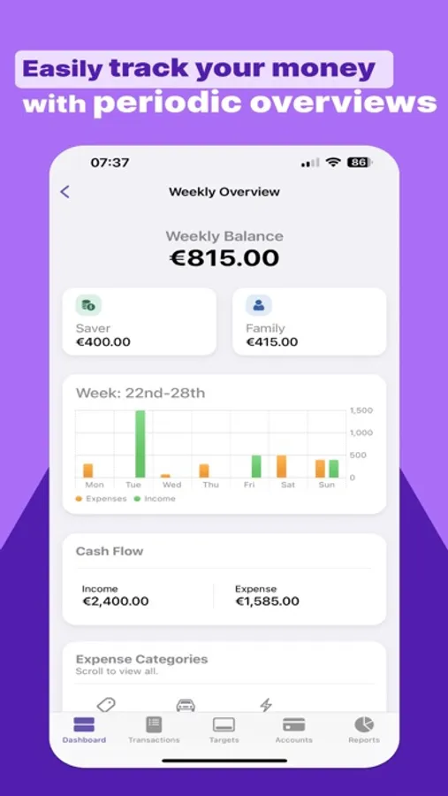 Income and Expense Targets: Set personalized income and expense targets to stay on track and make your financial dreams a reality. Monitor your progress, adjust your spending habits, and optimise your budget effortlessly.