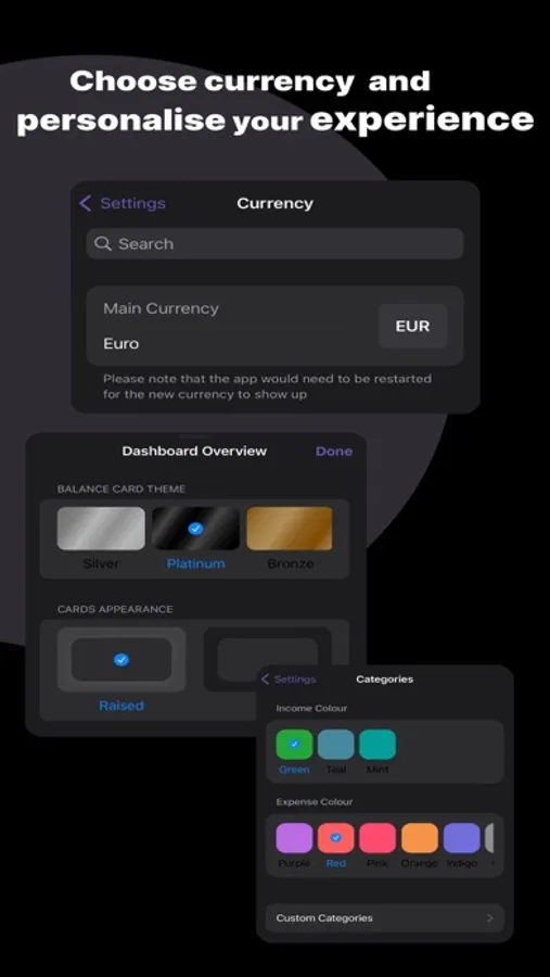 Custom Settings for Personalization: Tailor Moneta to your unique financial needs. Customise categories, labels, and colours and create a personalised experience that suits your style.