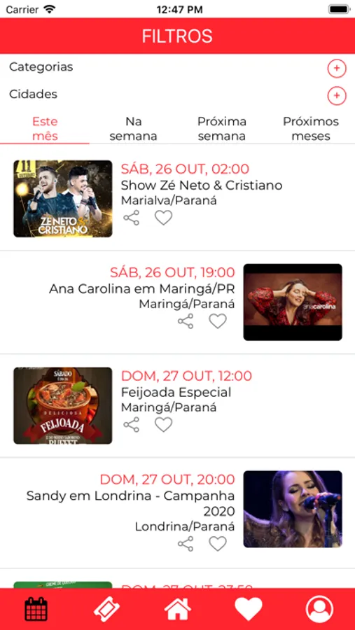 Ao encontrar um evento, você pode adicioná-lo à sua lista de “Favoritos” com apenas um clique e acessá-lo facilmente. Assim, você consegue conferir seus eventos preferidos sem precisar fazer uma nova busca.