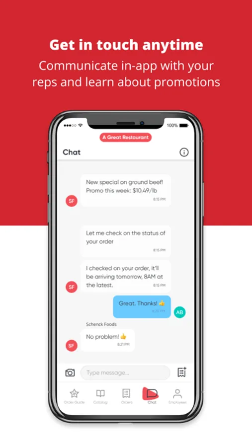 - Get in touch anytime: communicate directly with your Schenck Foods rep in the app