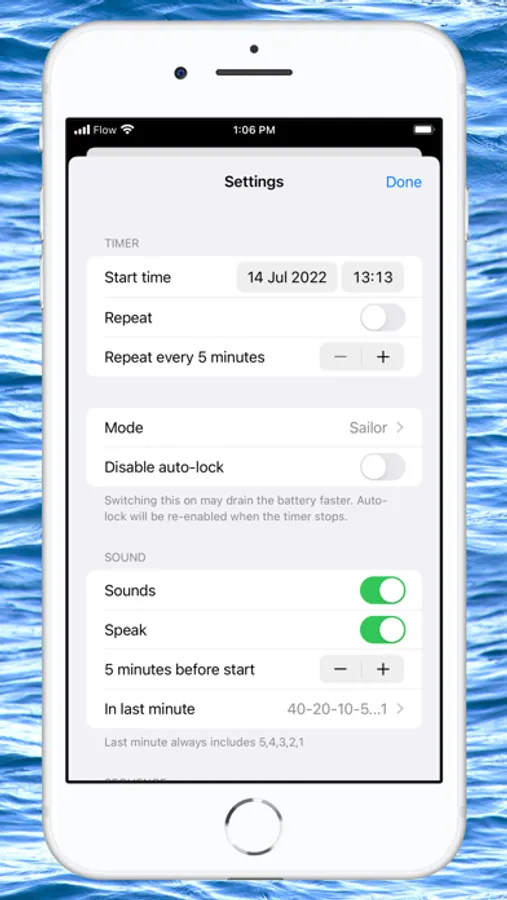 - Voice readouts of minutes to start and configurable seconds in the last minute