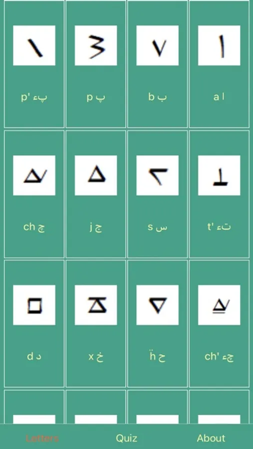 You can use the quiz section to test yourself after studying the letters. For ejective sounds that don't exist in English and Arabic, we transliterated by adding an apostrophe after the letter in Latin script or hamza after the letter in Arabic script.