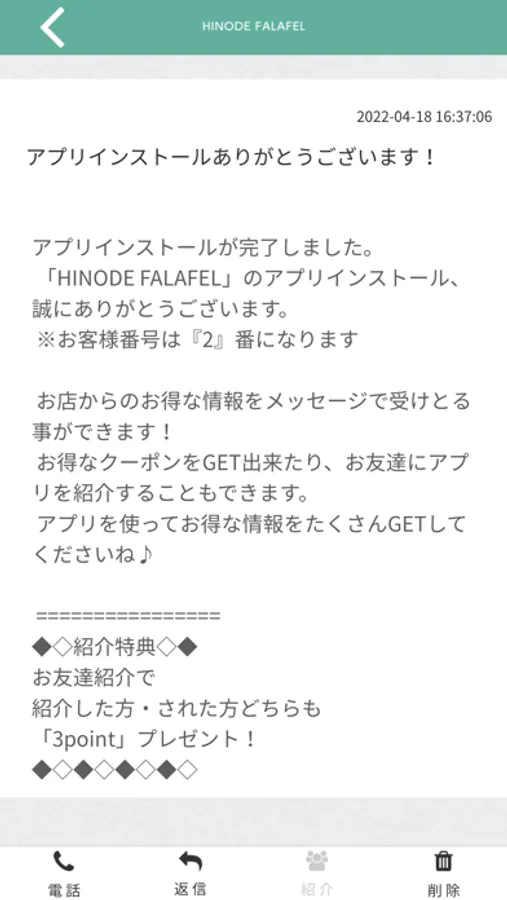 HINODE FALAFELのアプリをSNSを通じてお友達に紹介する事ができます。